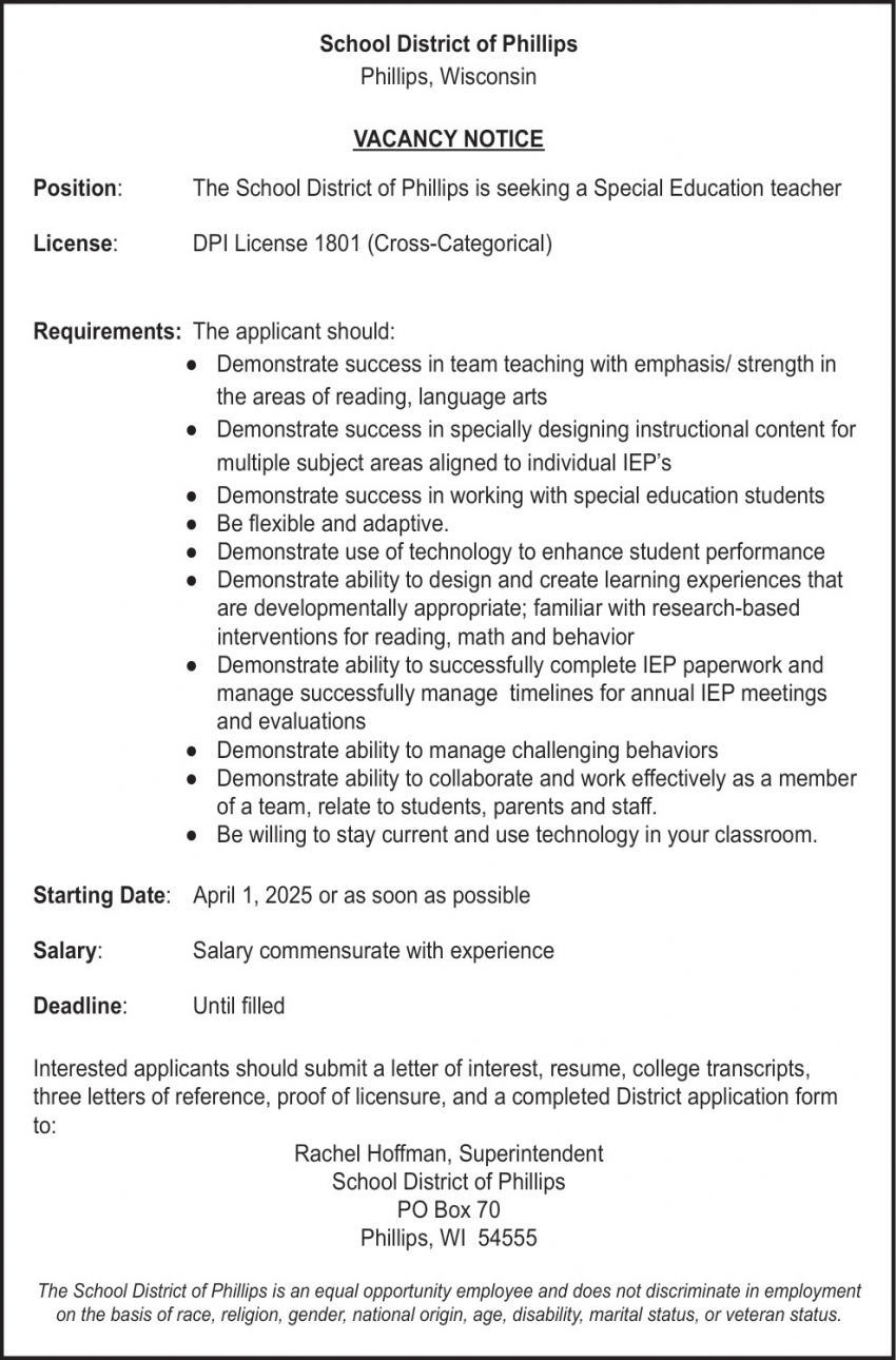 Mar 26, 2025. School District of Phillips Education Jobs from Wisconsin State Jobs