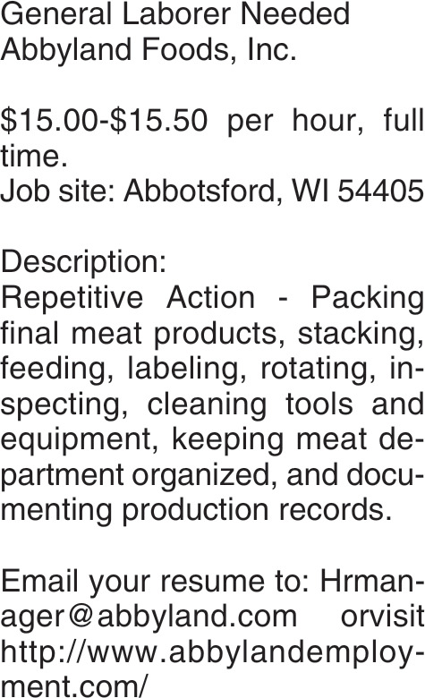 Jobs for Abbyland Foods, Inc. in Abbotsford, WI