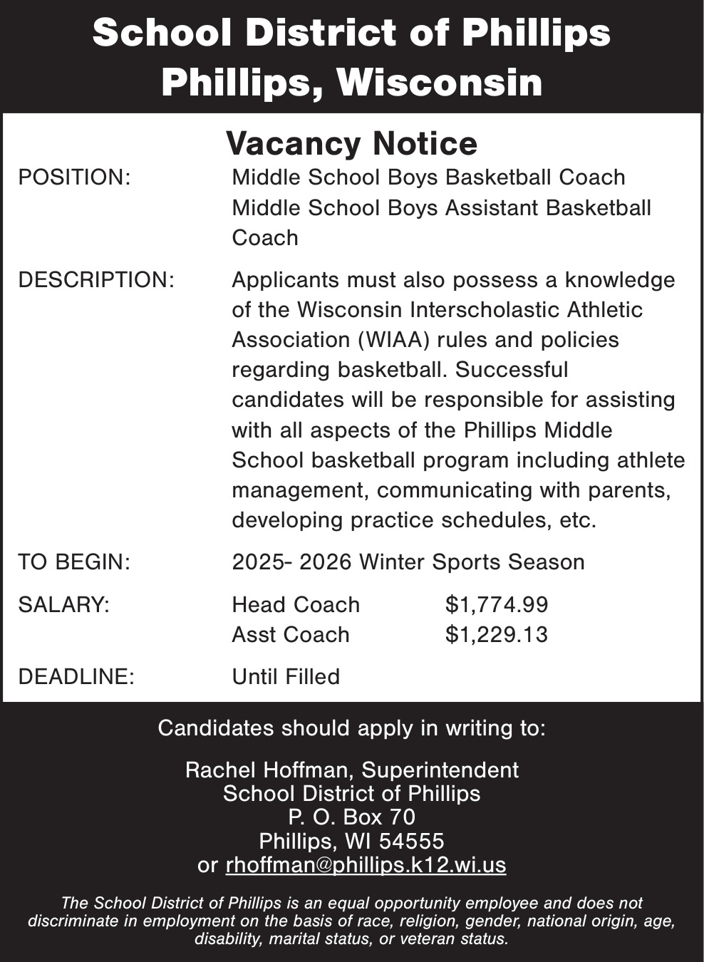 Middle School Boys Basketball Coach Job Opening in Phillips, WI
