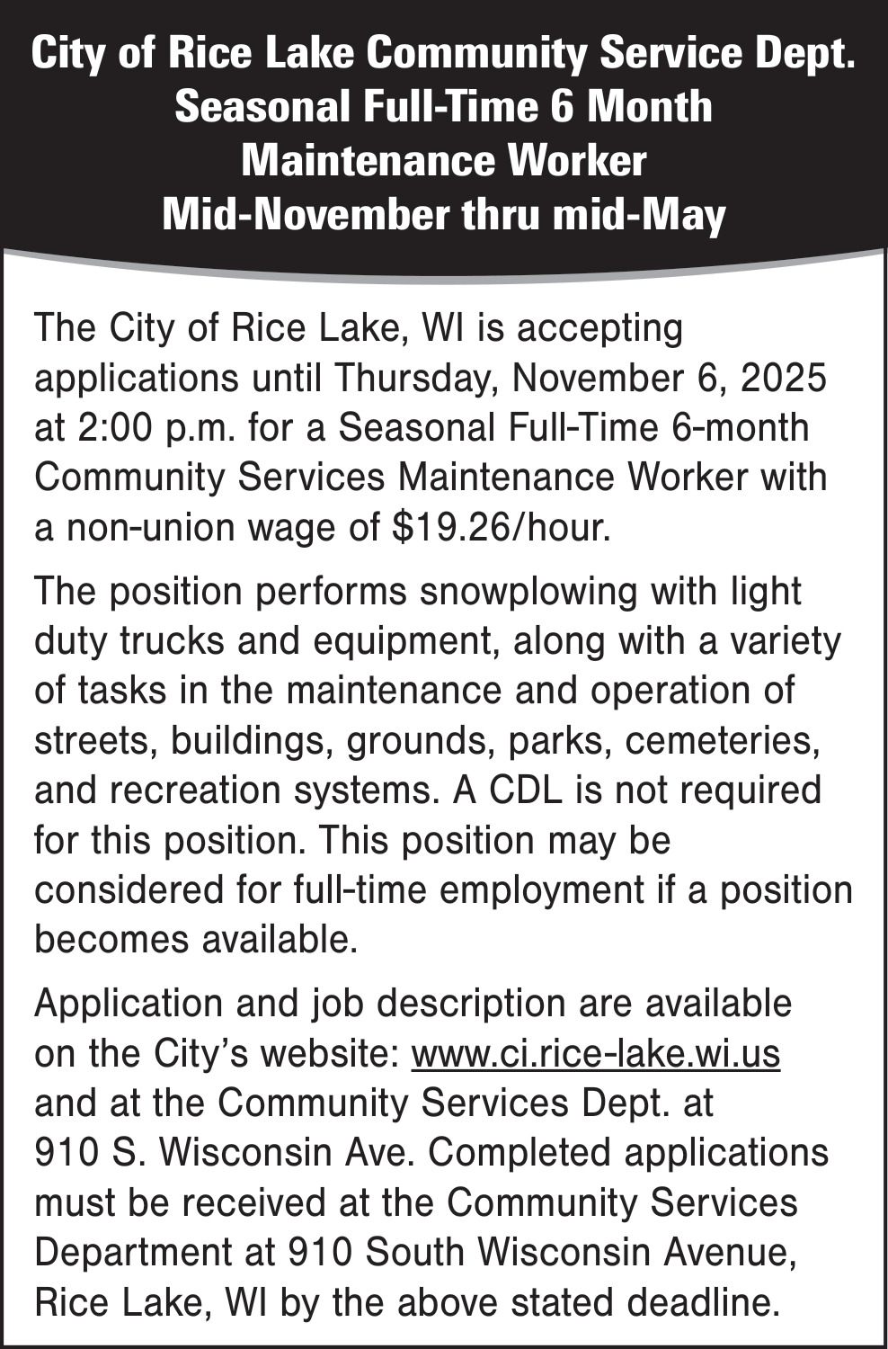 Oct 22, 2025. City of Rice Lake Maintenance Jobs from Wisconsin State Jobs