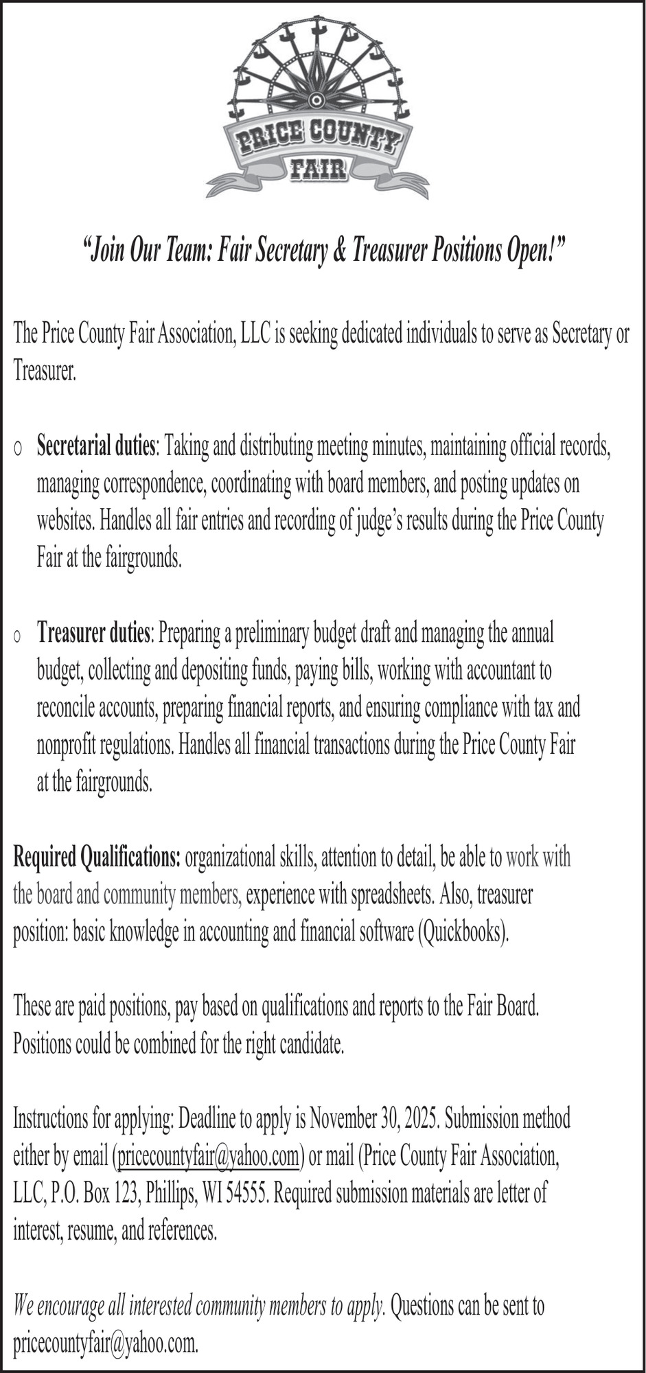 Oct 23, 2025. Price County Fair Association Secretary Jobs from Wisconsin State Jobs