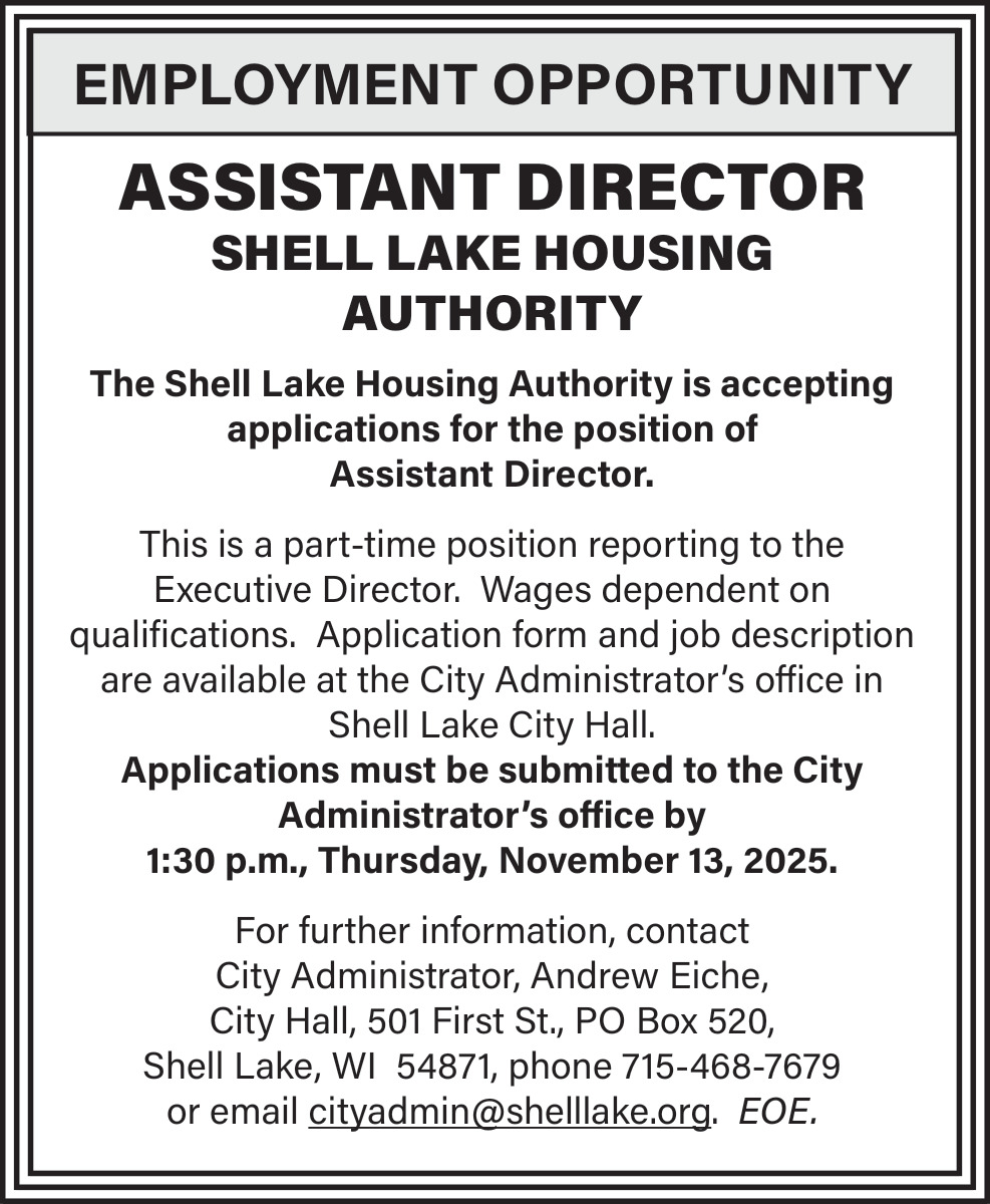 Oct 30, 2025. Shell Lake Housing Authority Assistant Jobs from Wisconsin State Jobs