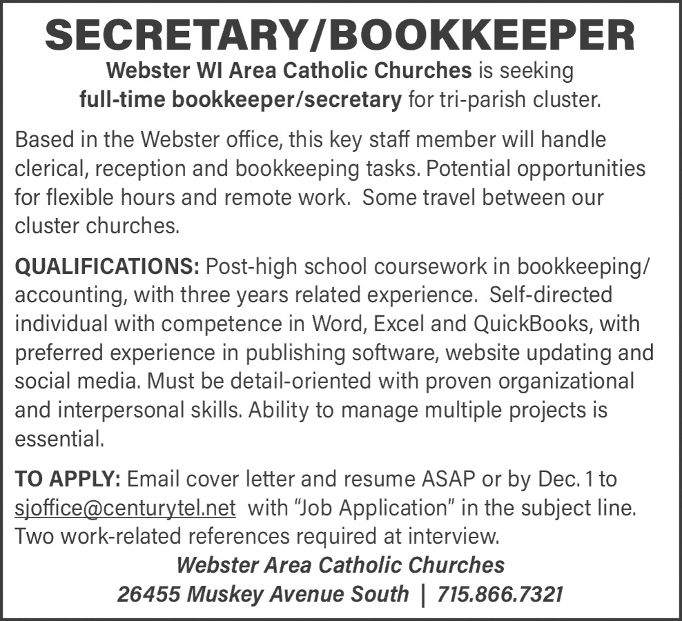 Nov 12, 2025. Webster WI Area Catholic Churches Secretary Jobs from Wisconsin State Jobs
