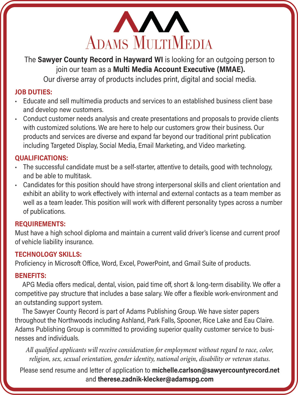 Multimedia Account Executive Job Near Me in Hayward, WI