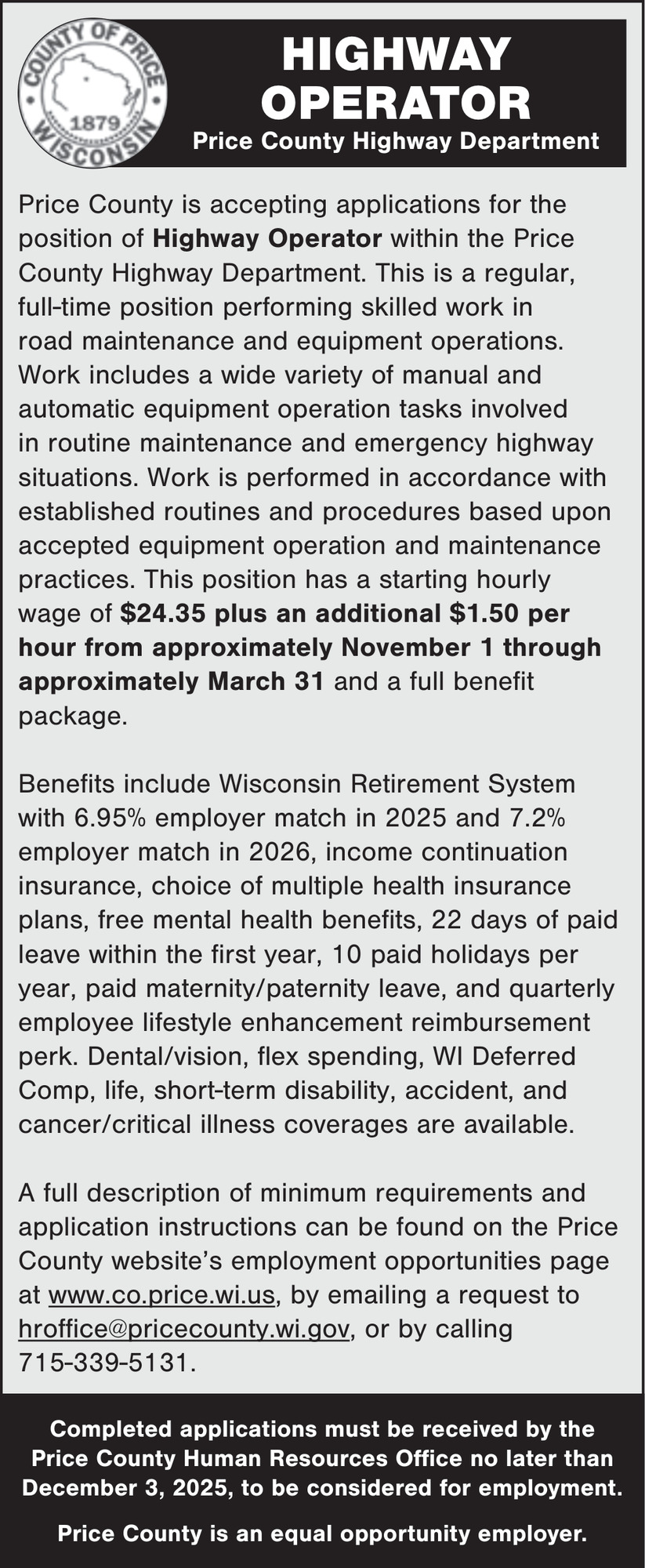Nov 22, 2025. Price County Highway Department Operators Jobs from Wisconsin State Jobs