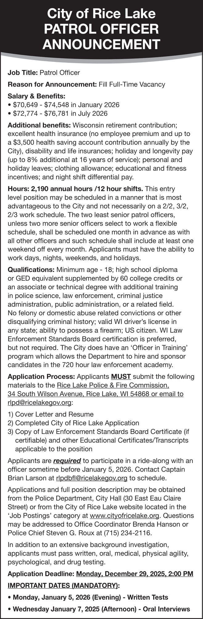 Dec 10, 2025. City of Rice Lake Government Jobs from Wisconsin State Jobs