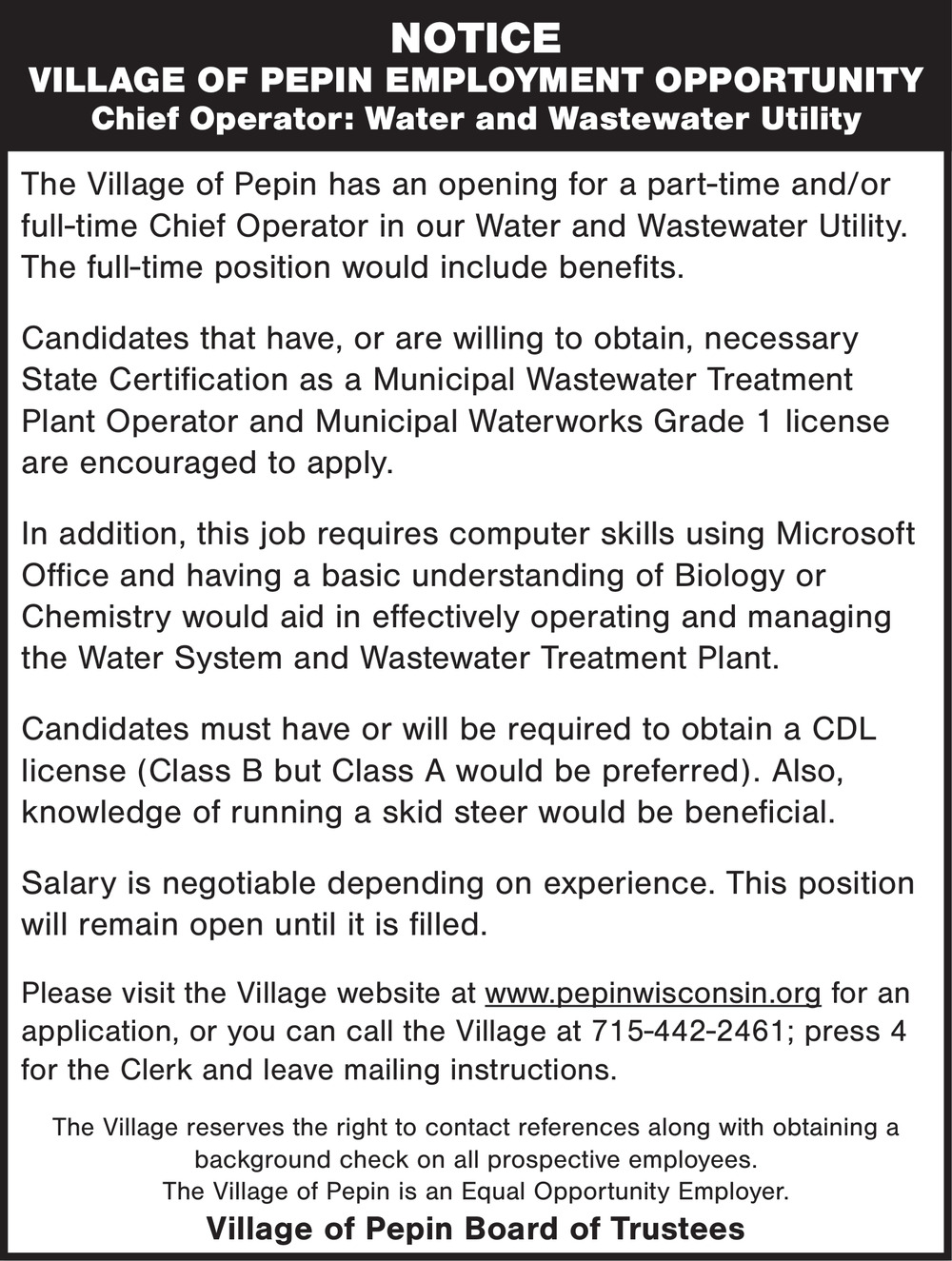 Water and Wastewater Utility Job Opening in Pepin, WI