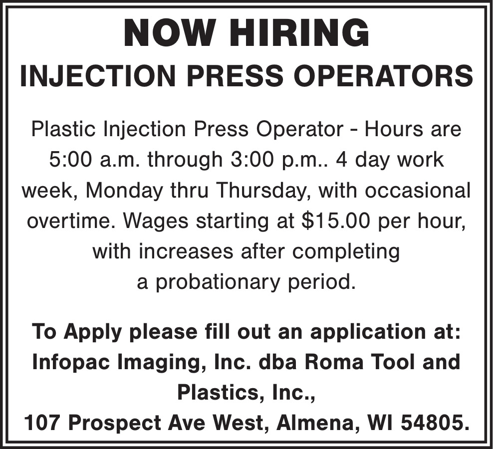Injection Press Operators Jobs Openings in Almena, WI