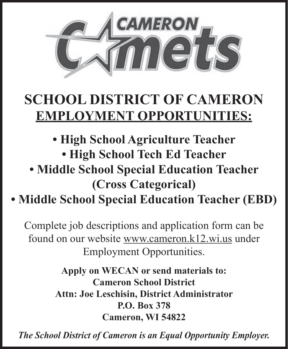 Jan 28, 2026. Cameron School District Education Jobs from Wisconsin State Jobs