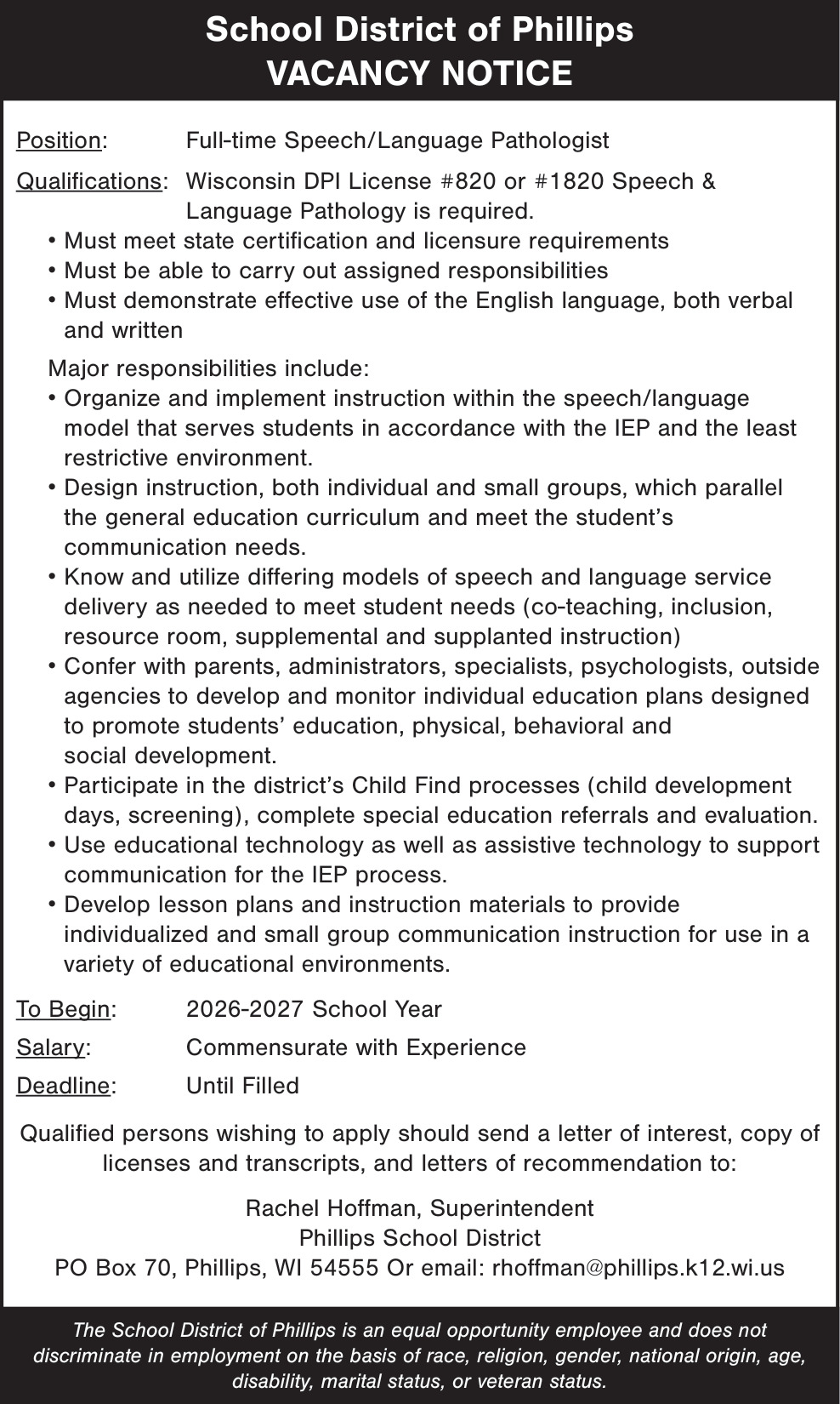 • Speech/Language Pathologist Job Opening in Phillips, WI