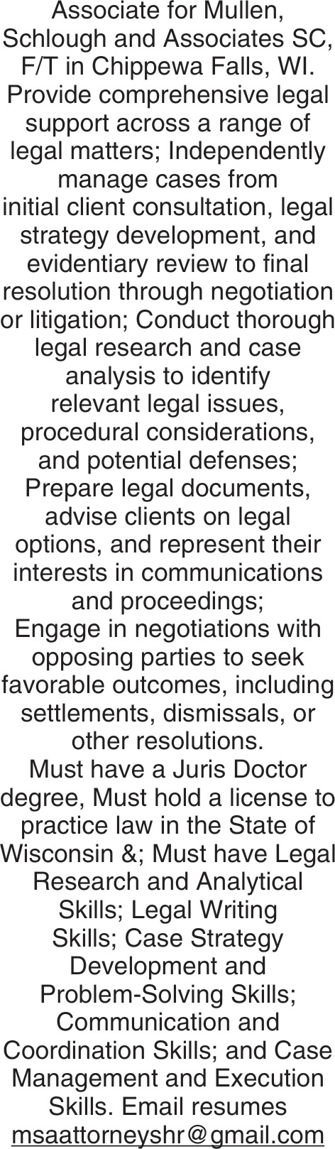 Feb 06, 2026. Mullen, Schlough and Associates SC Law Jobs from Wisconsin State Jobs
