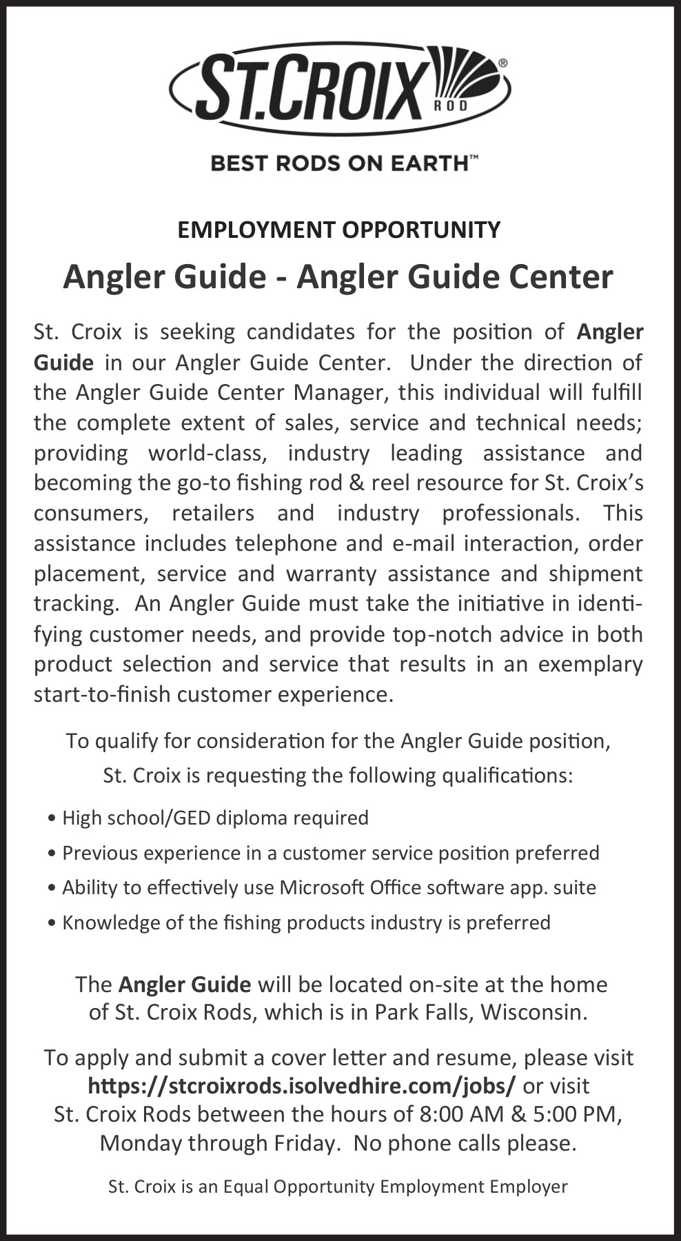 Feb 19, 2026. St. Croix Rod Customer Service Jobs from Wisconsin State Jobs
