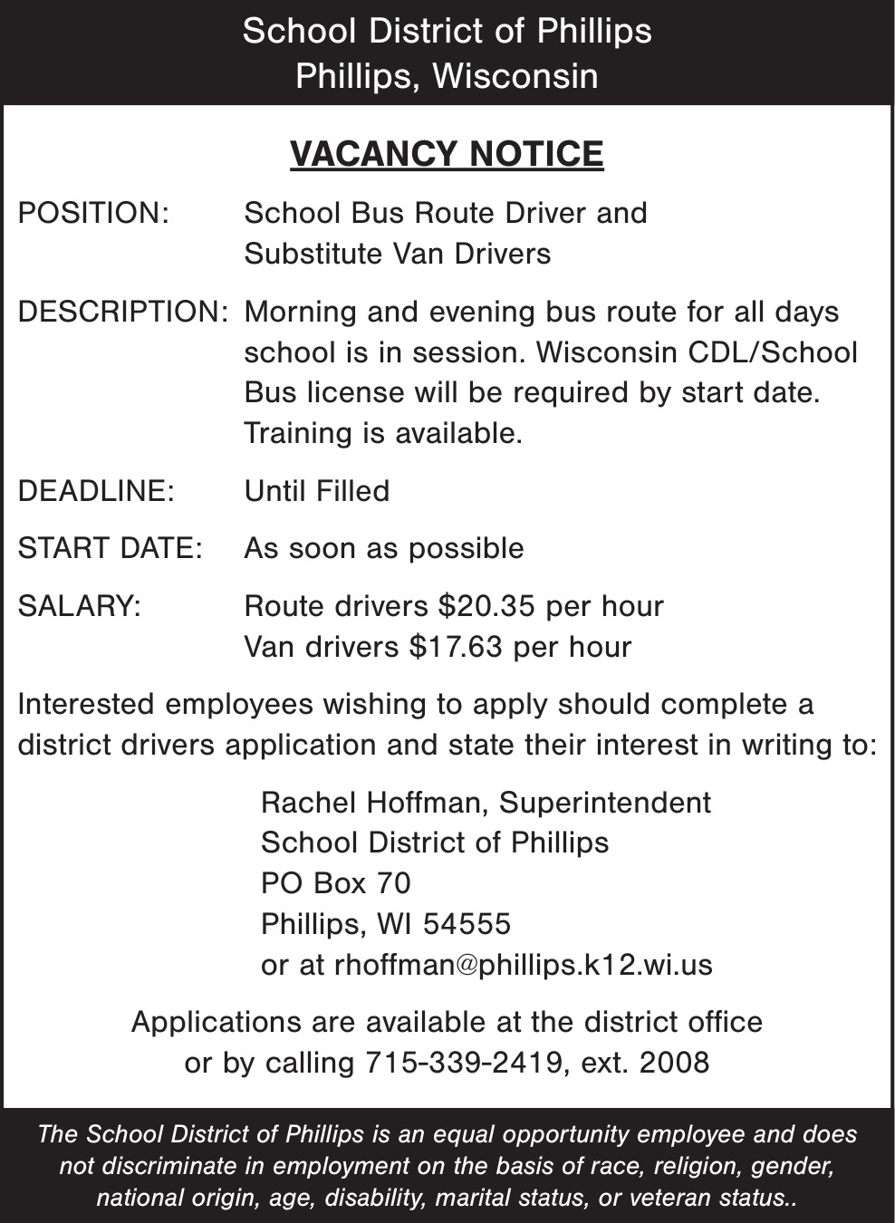 School Bus Route Driver Job Opening in Phillips, WI