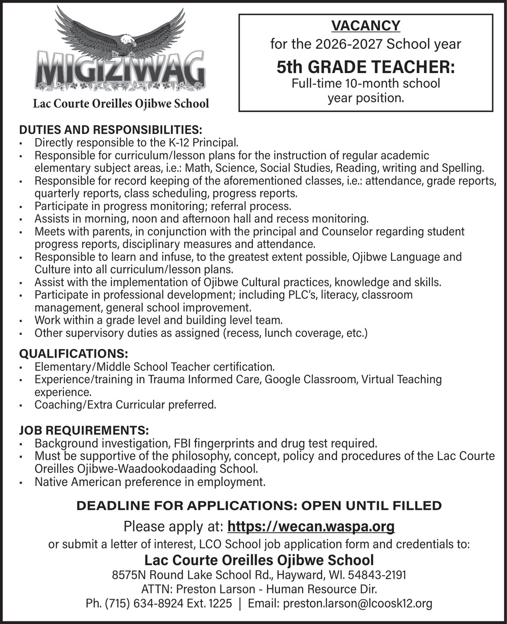 Mar 04, 2026. Lac Courte Oreilles Ojibwe School Education Jobs from Wisconsin State Jobs