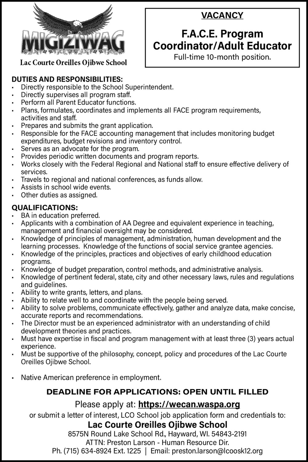 F.A.C.E. Program Coordinator Job in Hayward, WI