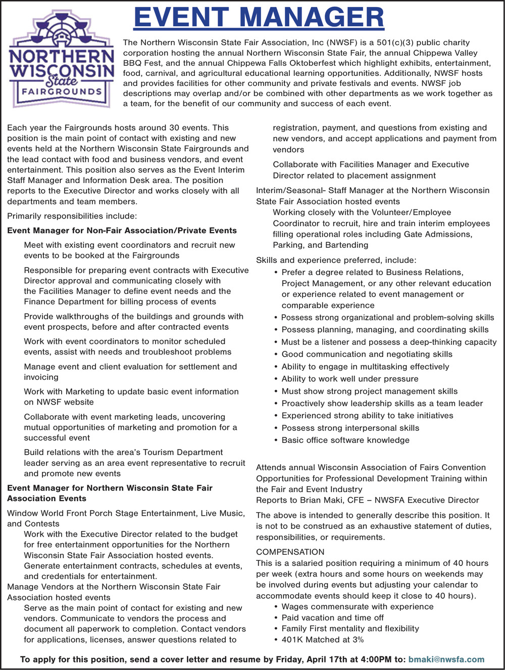 Event Manager Job Opening in Chippewa Falls, WI
