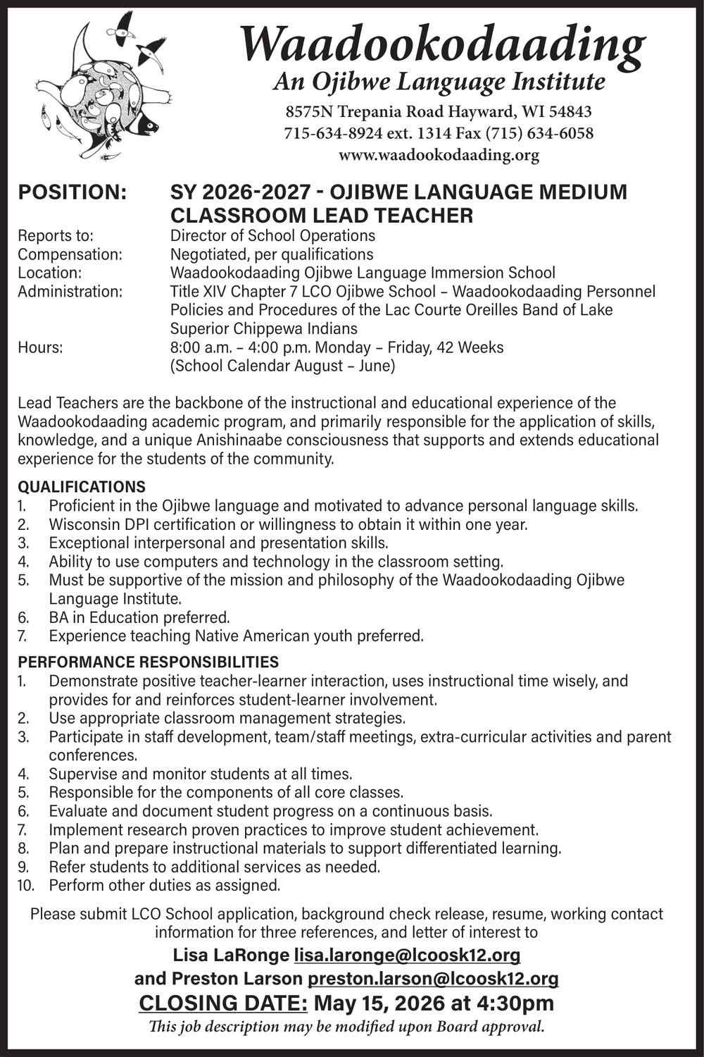 Apr 08, 2026. Waadookodaading Ojibwe Language Institute Education Jobs from Wisconsin State Jobs